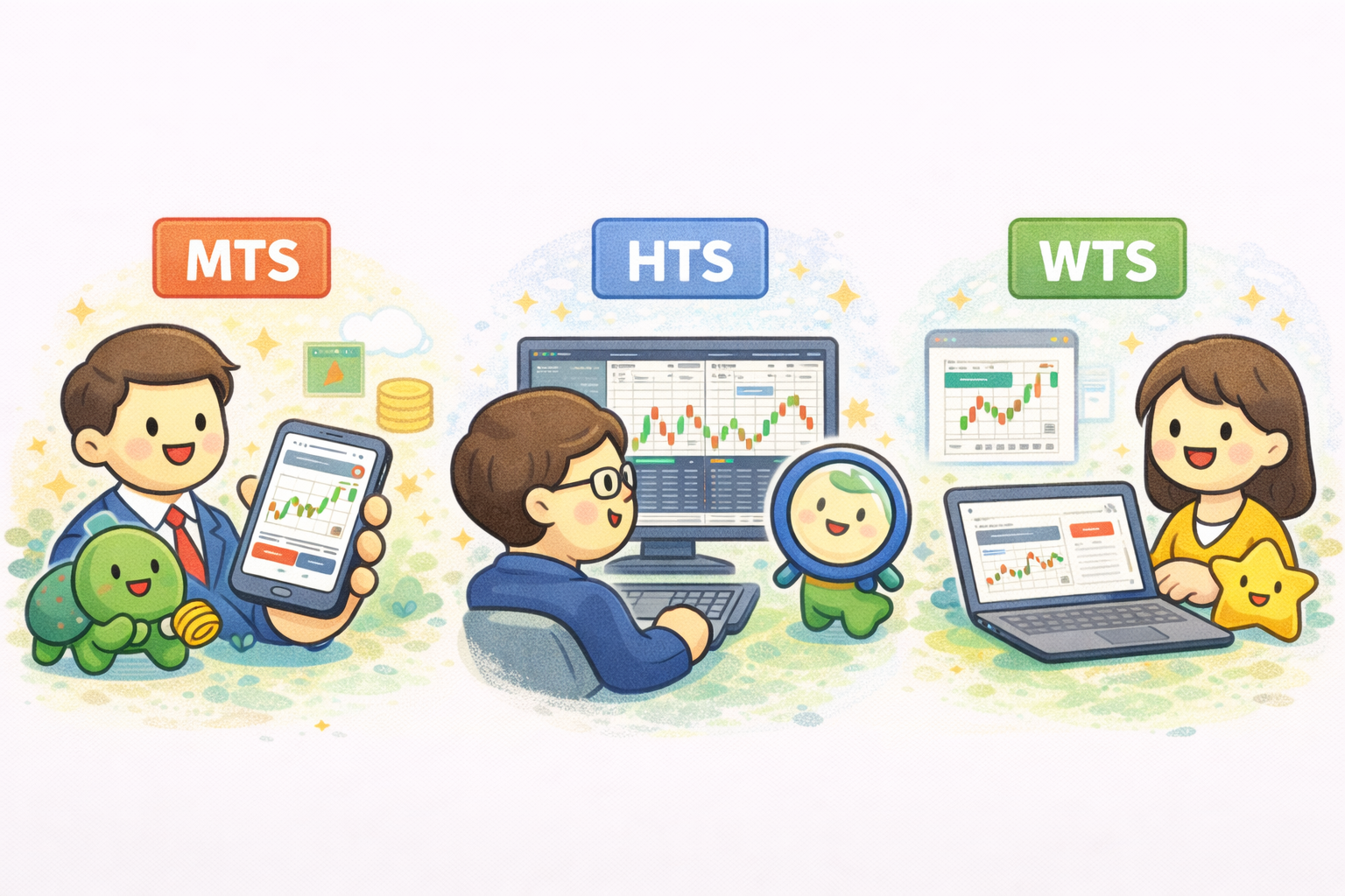 **HTS**는 Home Trading System으로 PC에 설치해서 쓰는 거래 프로그램을 말합니다. **WTS**는 Web Trading System으로 웹브라우저에서 접속해 거래하는 방식이죠. 한 문장으로 요약하면, MTS는 “휴대폰”, HTS는 “PC 프로그램”, WTS는 “웹”입니다. 같은 증권사라도 세 가지를 모두 제공하는 경우가 많고, 기능 구성이나 화면 구성은 서로 다를 수 있습니다.
