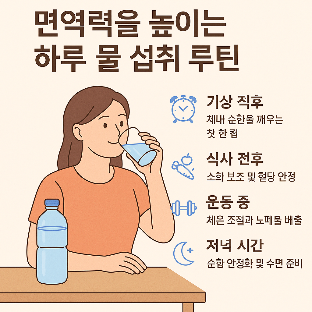 물을 많이 마신다고 해서 모두 같은 효과를 내는 것은 아닙니다. 중요한 것은 “언제, 어떻게, 얼마나” 마시는가입니다. 아래는 면역력을 높이기 위한 하루 물 섭취 루틴을 시간대별로 정리한 내용입니다.