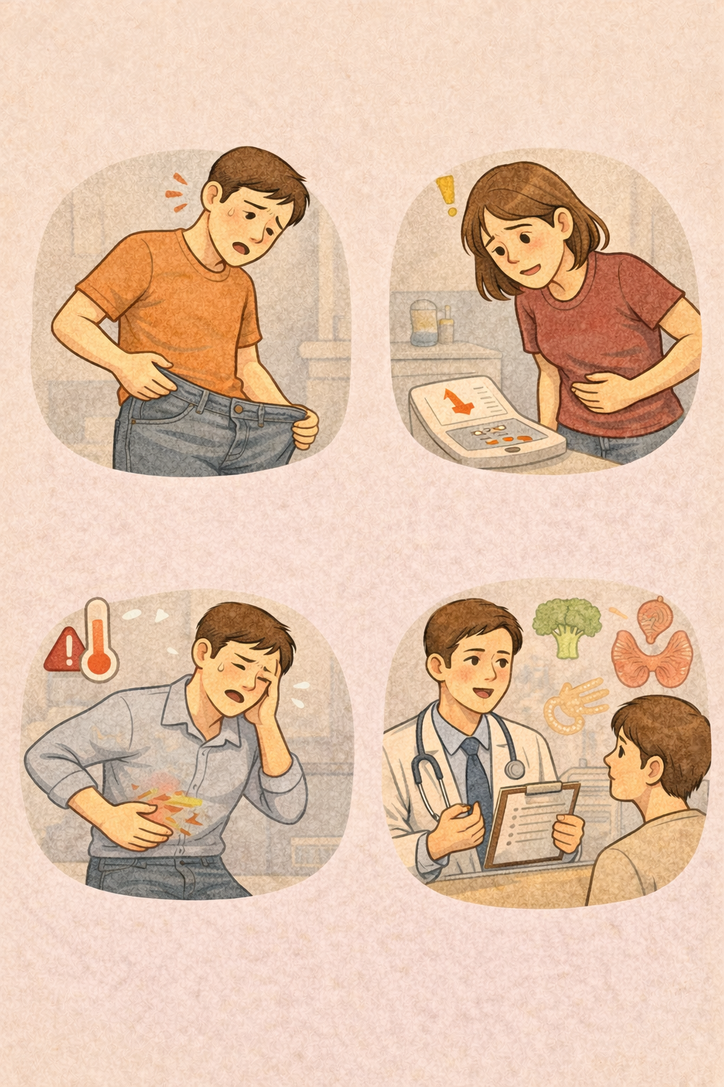- 갑상선 기능 항진: 대사가 올라가면서 잘 먹는데도 살이 빠질 수 있습니다. 두근거림, 더위 민감, 손 떨림, 잠이 얕아짐 같은 신호가 동반되기도 합니다.